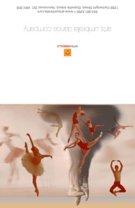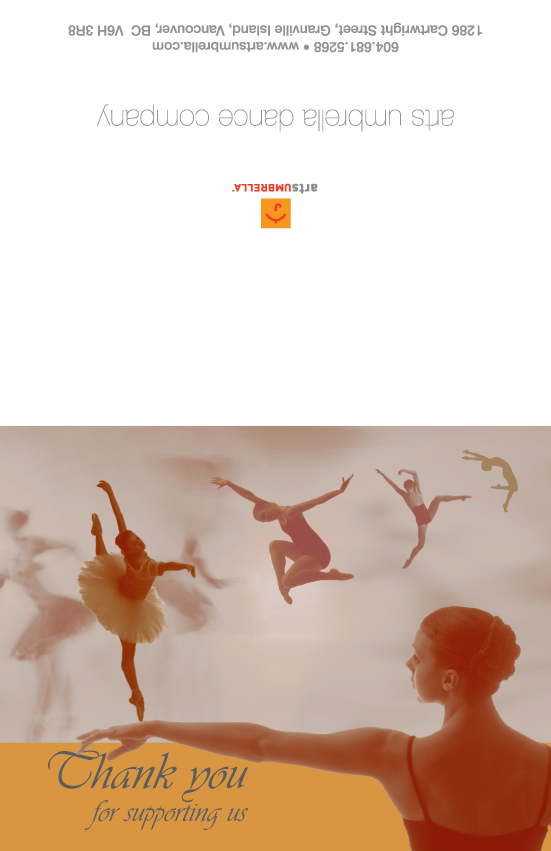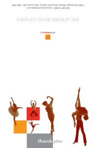 Some items designed for the Arts Umbrella Dance Company as part of parent volunteer contribution. Some were used and ones that were not may still be used. Excluding the Emily Molnar graphic, all of the figures are dancers from the Arts Umbrella Dance Company. The Emily Molnar graphic was used to honour her when she left AU to direct Ballet BC. The shirt designs were the beginning of developing sellable swag to raise funds for the dance company. The cards were developed to thank donors and volunteers as well as to sell as greeting cards to help recover costs.