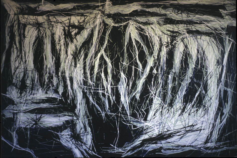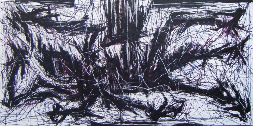 acrylic, digital mediaReturning somewhat to the style of a painting from 1989, I painted this canvas at the request of my son. He wanted a black and white painting that had dance figures. I wanted to do an abstracted figure shape in a horizontal multilimbed pose. Kali as a gothic break dancer. We were both satisfied.