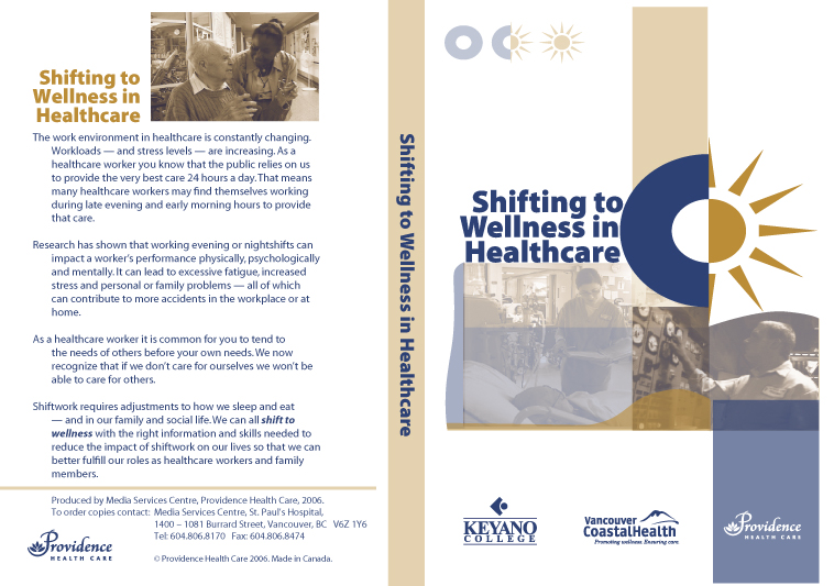 These educational materials were part of a project designed to support shift workers to live healthy lifestyles. The booklet was litho printed in 2 colours. The photo images are screen captures from the video and were altered to duotones.